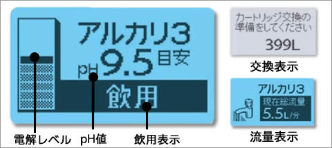 | 電解 | <電解モード>アルカリ:5段階、酸性:2段階※1 <処理水量> [動水圧100kPa(約1kgf/cm2)]の場合 吐水量/アルカリイオン水(酸性イオン水):約2.0L/分 [動水圧350kPa(約3.5kgf/cm2)]の場合 吐水量/アルカリイオン水(酸性イオン水):約5.5L/分 ※1:強アルカリ使用時に酸性水スタンドから排出されるpH2.8 程度の酸性水を含む。 |