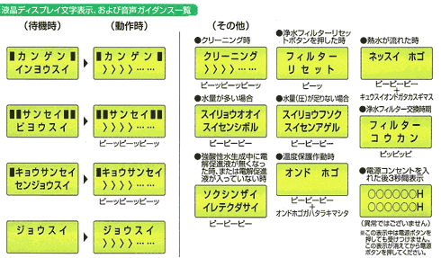 ご希望の生成水や、待機中・動作モードは、液晶ディスプレイに表示されるので一目瞭然です。フィルター交換時期、自動クリーニング中、誤って45度以上のお湯が流れた場合などにも、液晶ディスプレイに文字とブザーでお知らせします。